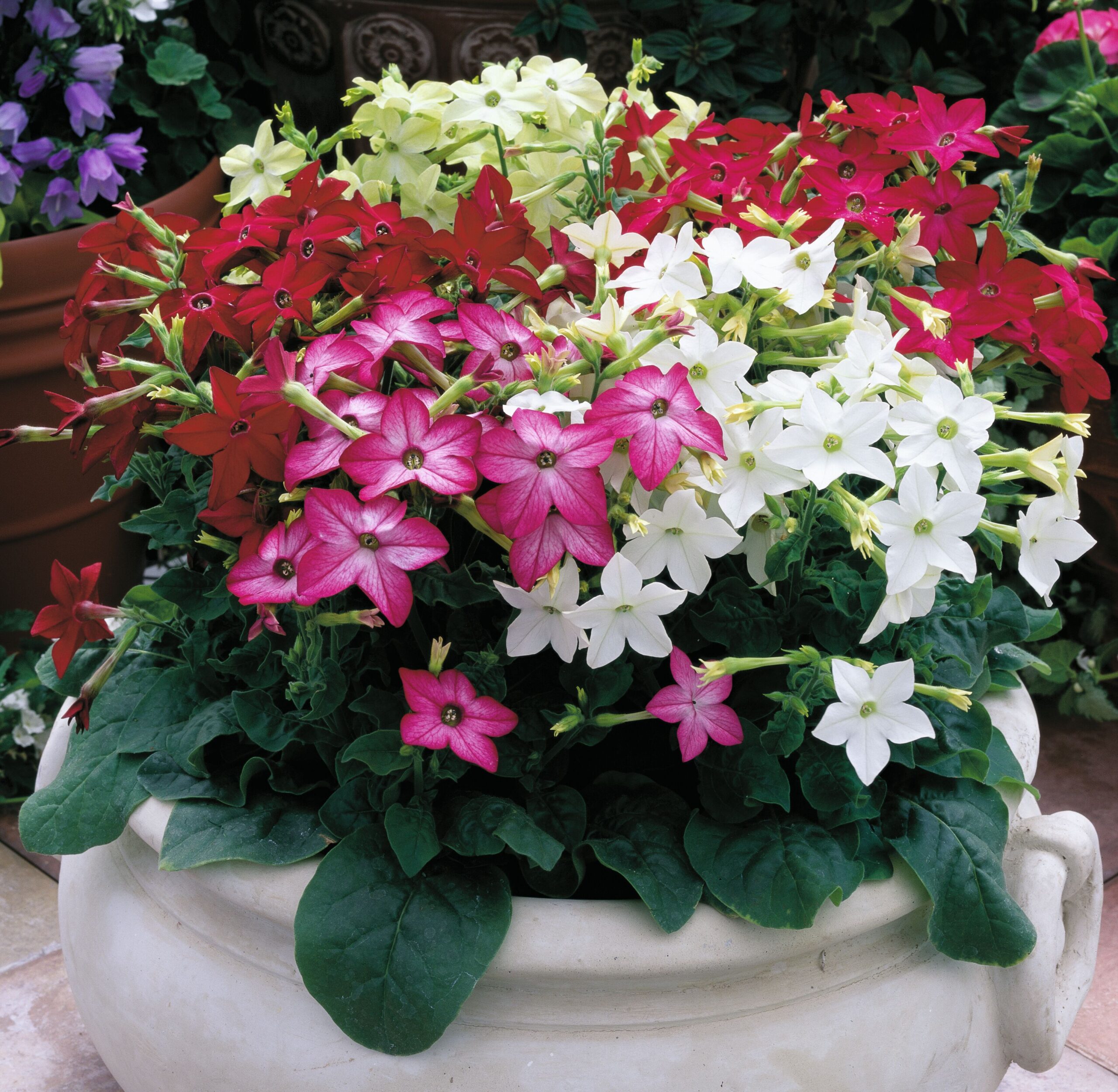 Dekorativ tobak Saratoga Mix är en tidig sort som bildar en klotformad planta med blommor överallt.