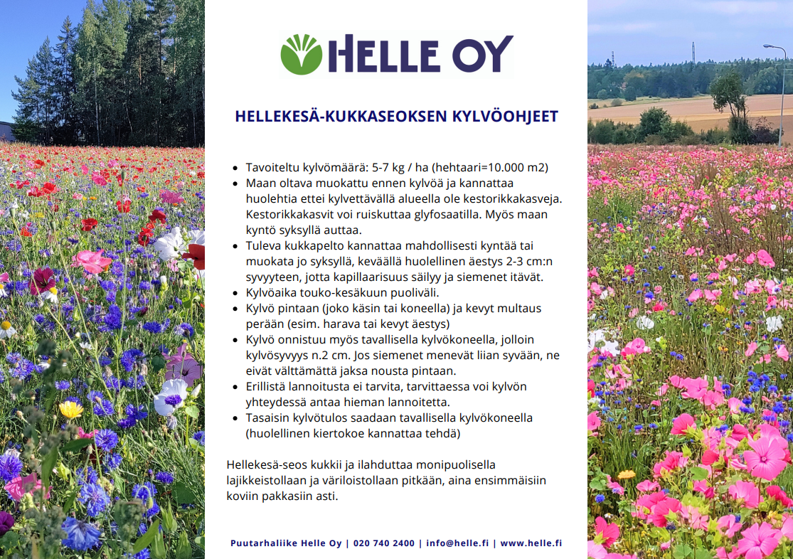 HelleKesäe-fröblandningen är en blandning av flera blomarter och blommar så länge som möjligt. Hellebore ger glädje åt pollinatörer och pollinatörer, färg till landskapet och blommorna är också lämpliga som snittblommor att samla i en vas. Det är en blommande fröblandning som är lämplig för landskapsarkitektur, som uppfyller EU: s villkor för biologisk mångfald Field / Landscape Seed Mix, och är också lämplig för sådd. Innehåll:
